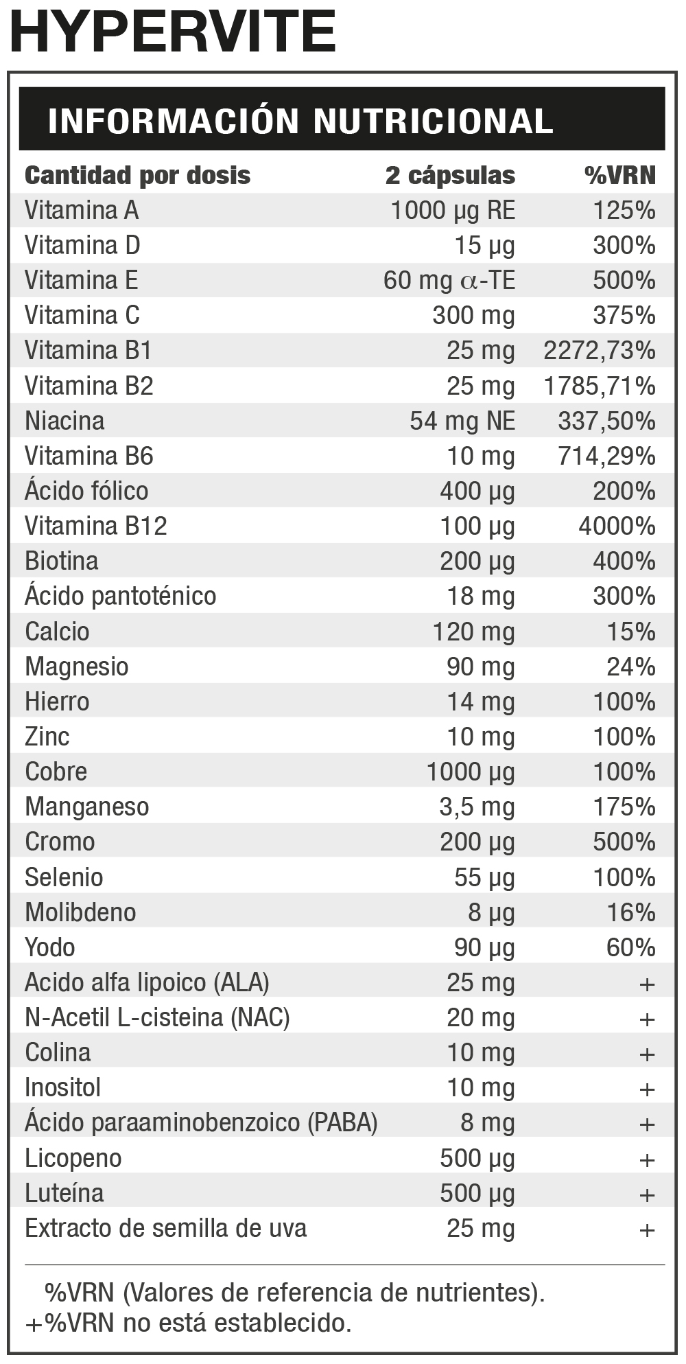 HYPERVITE es fuente de las siguientes vitaminas y minerales que aportan las siguientes propiedades saludables*: