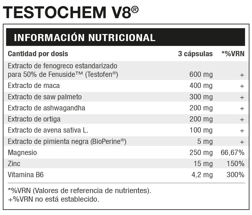 TESTOCHEM V8 de HERO TECH NUTRITION es la evolución en los suplementos pro-hormonales. Después de un largo trabajo de estudio y desarrollo minucioso ya tenemos la más completa fórmula para el apoyo a los niveles de testosterona endógena con 100% de extractos de plantas de calidad Premium. TESTOCHEM V8 está destinado para atletas que enfocan su entrenamiento en el aumento tanto en la potencia como en el desarrollo de la masa muscular. El estrés, una no correcta alimentación y la edad influyen directamente en la bajada de los niveles de testosterona con lo cual esto repercute en una mayor pérdida de fuerza y vitalidad.
