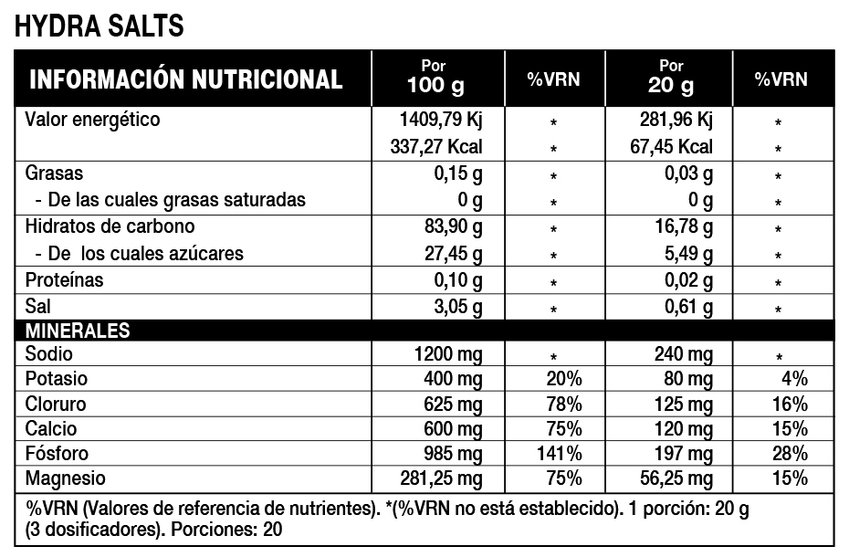 HYDRA SALTS de HERO TECH NUTRITION es un preparado alimenticio para una bebida isotónica deportiva a base de hidratos de carbono y electrolitos. Las soluciones electrolíticas a base de hidratos de carbono mejoran la absorción de agua durante el ejercicio físico*. HYDRA SALTS - Preparado alimenticio en polvo para bebida isotónica deportiva a base de hidratos de carbono y electrolitos. Con azúcar y edulcorante. SABOR: Limón. PESO NETO: 400 G. Con un valor energético reducido (reducción de más de un 30% frente a una bebida isotónica clásica). INGREDIENTES: Maltodextrina, dextrosa, aromas, citrato de sodio, acidulante (ácido cítrico), sales cálcicas de ácido ortofosfórico, sales magnésicas de ácido ortofosfórico, sal, sales potásicas de ácido ortofosfórico, edulcorante (sucralosa), colorante (curcumina). MODO DE EMPLEO: Mezclar 1 porción (20 g = 3 dosificadores) en 500 ml de agua. Tomar durante la actividad física. Puede contener trazas de leche, soja, gluten, apio, huevo, dióxido de azufre y sulfitos, pescado, moluscos y crustáceos. Fuente de magnesio y calcio. El magnesio y el calcio contribuyen al funcionamiento normal de los músculos. El magnesio ayuda a disminuir el cansancio y la fatiga. El magnesio contribuye al equilibrio electrolítico. Conservar en lugar fresco y seco. Es importante mantener una dieta variada y equilibrada y un estilo de vida saludable.