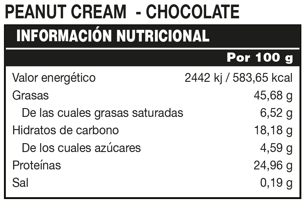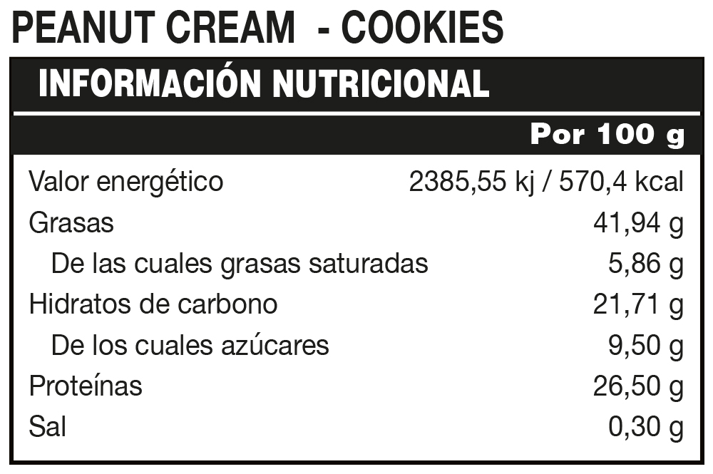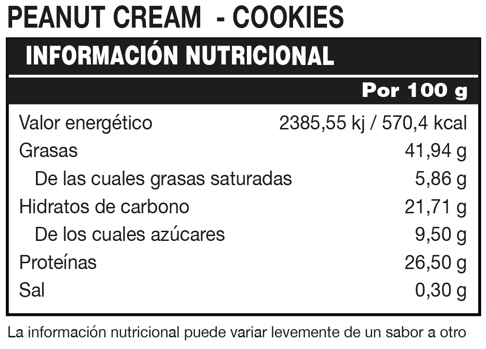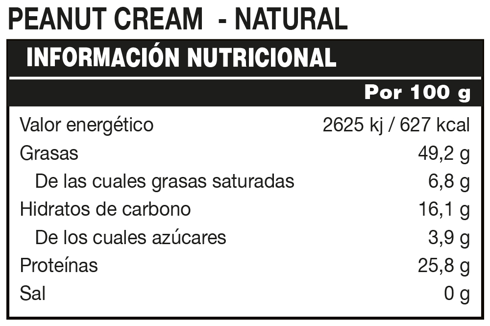 Es una deliciosa crema a base de cacahuetes en 3 deliciosos sabores: NATURAL, COOKIES, CHOCOLATE, ideal para untar en tu snack favorito a cualquier hora del día. Peanut Cream contiene un 25% de PROTEÍNAS. PEANUT CREAM es FUENTE DE PROTEÍNAS. *Las proteínas contribuyen a que aumente la masa muscular. PEANUT CREAM es un alimento "SIN AZÚCARES AÑADIDOS". Contiene azúcares naturalmente presentes. Es un producto con 0% DE SAL AÑADIDA , SIN GLUTEN y SIN ACEITE DE PALMA.