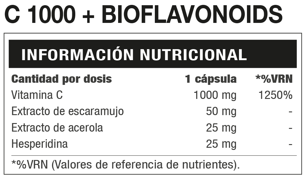 C1000+BIOFLAVONOIDS de HERO TECH NUTRITION es un complemento alimenticio a base de vitamina C y bioflavonoides procedentes de extractos de plantas (Escaramujo, acerola y hesperidina). C1000+BIOFLAVONOIDS es fuente de vitamina C y contiene 1000 mg por dosis diaria recomendada. La vitamina C contribuye a la formación normal de colágeno para el funcionamiento normal de los vasos sanguíneos, huesos y cartílagos, y al funcionamiento normal del sistema inmunitario durante el ejercicio físico intenso y después de este*.