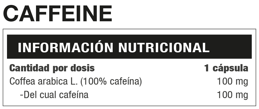 Es una fórmula a base de 100% cafeína en forma natural extraída de la planta Coffea arabica L. CAFFEINE al ser una fórmula natural es una forma fácil y efectiva de tomar cafeína con los efectos naturales y estimulantes que aporta la cafeína para afrontar tanto sesiones de ejercicio físico moderado o intenso. CAFFEINE se presenta en cápsulas de 100 mg de cafeína 100% natural.