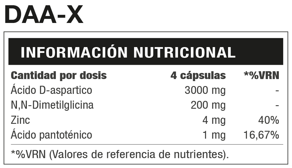 DAA-X de HERO TECH NUTRITION es un multi-complejo de ácido D-aspártico, N,N-Dimetilglicina, zinc y ácido pantoténico. DAA-X es un producto con ingredientes que son muy utilizados por aquellos atletas que desean utilizar complementos alimenticios legales huyendo así del uso de sustancias prohibidas.