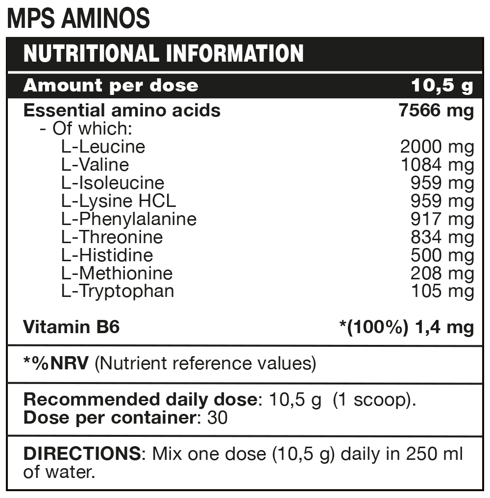 HERO TECH NUTRITION MPS AMINOS contains the “MASTERS” amounts of each of the 9 essential amino acids (including BCAA-s) as support for muscle protein synthesis (MPS) which gives it a perfect “PATTERN " of activity.