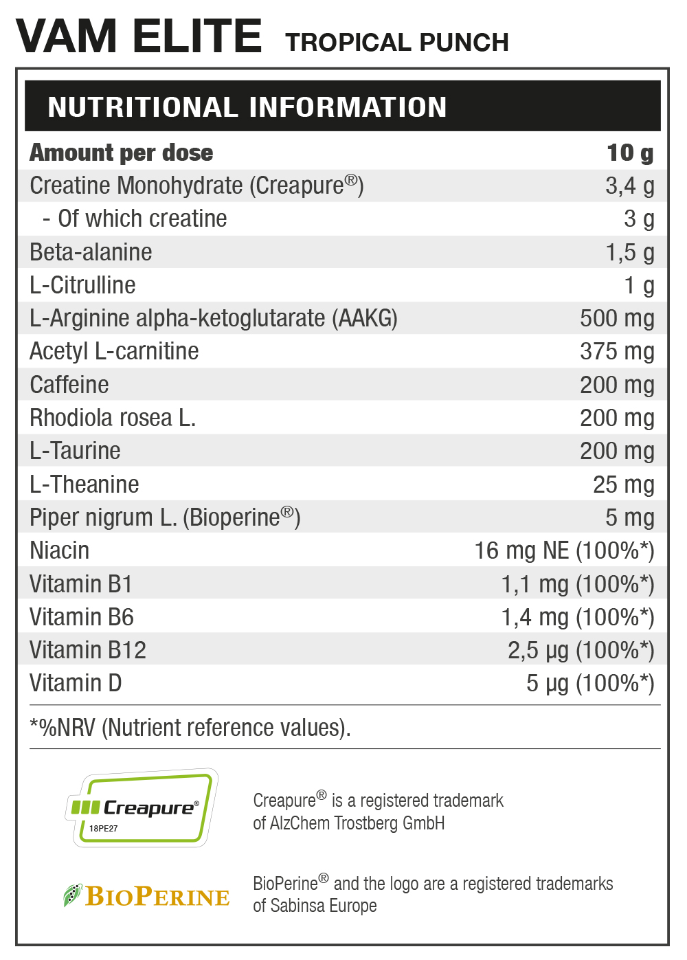 Is a food supplement and stimulating pre-workout complex, exclusively targeting adults performing high intensity exercise. VAM ELITE contains: