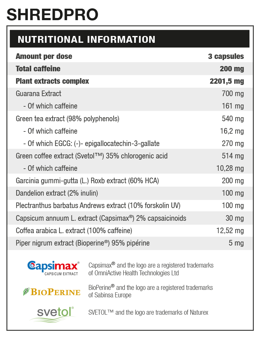 INGREDIENTS: Guaraná seed extract (Paullinia cupana kunth), green tea leaf extract (Camellia Sinensis (L) Kuntze) 98% polyphenols, green coffee seed extract (Coffea canephora Pierre ex Froehner (Svetol™) 35% chlorogenic acid), capsule [glazing agent (hydroxypropyl methyl cellulose), colorant (copper complexes of chlorophylls and chlorophyllins)], garcinia gummi-gutta (L.) Roxb. fruit extract (60% HCA: hydroxycitric acid), bulking agent (microcrystalline cellulose), dandelion root extract (Taraxacum officinale Web) 2% inulin, plectranthus barbatus Andrews root extract (10% Forskolin UV), capsicum annuum L. fruit extract (Capsimax®) 2% capsaicinoids, anti-caking agents (magnesium salts of fatty acids, silicon dioxide), coffea arabica L. seed extract, piper nigrum L. fruit extract (BioPerine®) 95% piperine. WARNINGS: Keep in a cool and dry place, heat and sun can damage the container. Keep out of the reach of children. Food supplements should not be used as a substitute for a balanced diet. Do not exceed the recommended daily dose. Its use is not recommended to people with antidiabetic treatment or who suffer cardiac problems. Should not be consumed if you are consuming other products containing green tea on the same day. Should not be consumed by pregnant or lactating women and children below 18 years old. Should not be consumed on an empty stomach. Not to consume a daily amount of 800 mg of EGCG. If any disorders occur after using the product, eg liver function or central nervous system, stop taking the product and consult a doctor. May contain traces of gluten, milk, egg, soy, celery, sulphur dioxide and sulphites, fish, crustaceans and molluscs.