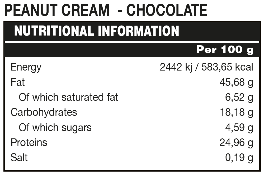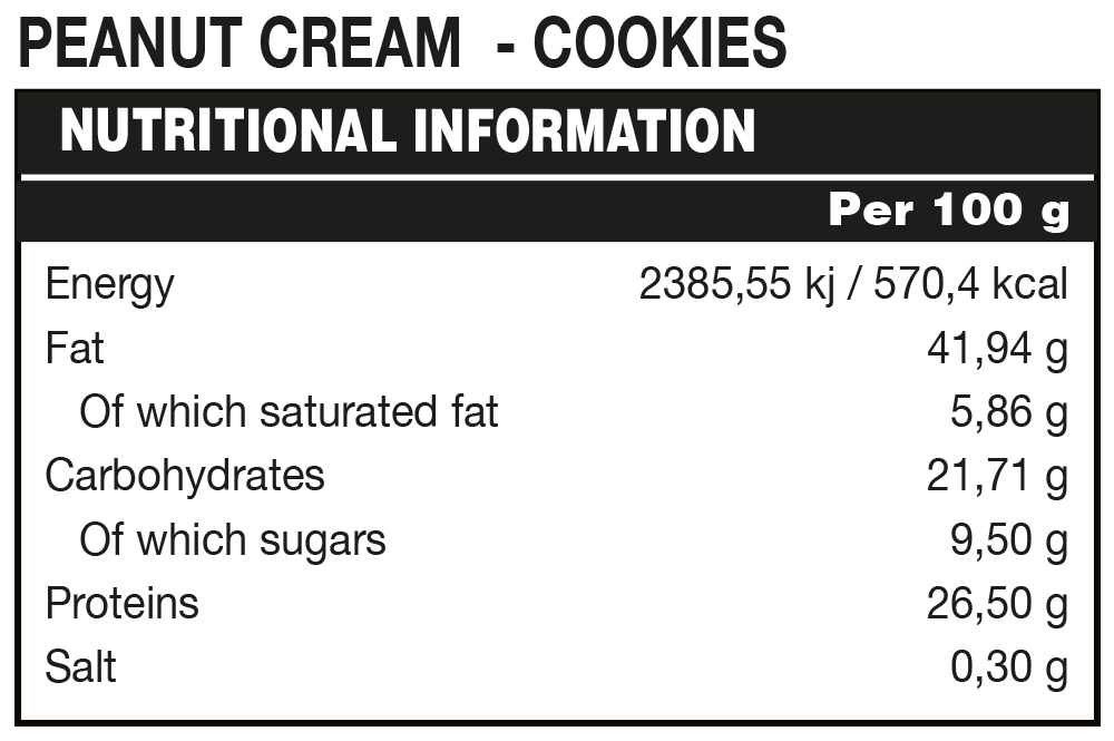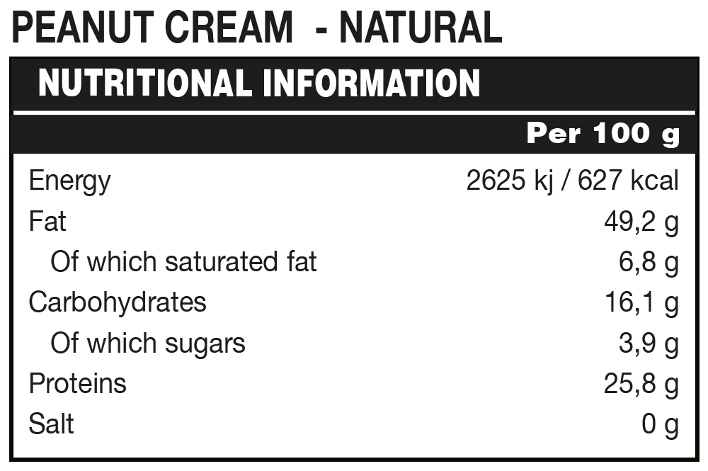 It is a delicious peanut-based cream in 3 delicious flavors: NATURAL, COOKIES, CHOCOLATE, ideal to spread on your favorite snack at any time of the day. PEANUT CREAM contains 25% PROTEIN. PEANUT CREAM is a SOURCE OF PROTEIN. *Protein contributes to a growth in muscle mass. PEANUT CREAM is a "WITH NO ADDED SUGARS" food. CONTAINS NATURALLY OCCURRING SUGARS. It is a product with 0% ADDED SALT, GLUTEN FREE and PALM OIL FREE.