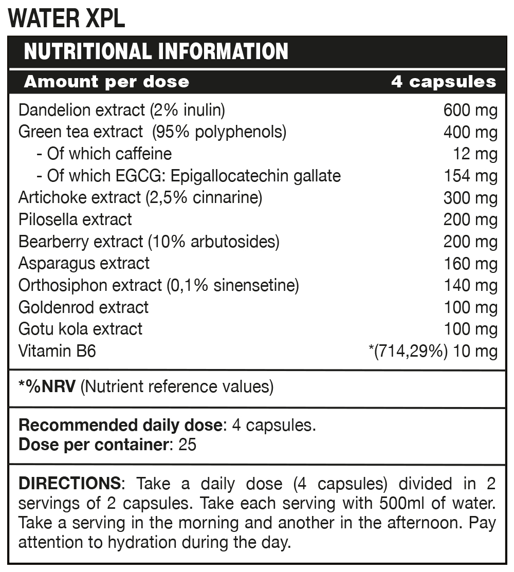 INGREDIENTS: Bulking agent (microcrystalline cellulose), dandelion extract (Taraxacum officinale (L.) Weber ex F.H.Wigg.) 2% inulin (root), capsule [glazing agent (hydroxypropyl methyl cellulose)], green tea extract (Camellia sinensis (L.) Kuntze) (leaf), artichoke extract (Cynara scolymus L.) 2,5% cinnarine (leaf), pilosella extract (Hieracium pilosella L.) 5:1 (leaf, flower, root,grass,rhizome), bearberry extract (Arctostaphylos uva ursi L. Spreng.) 10% arbutosides 4:1 (leaf), asparagus extract (Asparagus officinalis L.) 10:1 (root), orthosiphon extract (Orthosiphon aristatus (Blume) Miq.) 0,1% sinensetine 15:1 (leaf), goldenrod extract (Solidago virgaurea L.) 10:1 (grass with flowers), gotu kola extract (Centella asiatica L. Urb.) 10% asiaticosides (grass with flowes, grass, leaf), anti-caking agent (magnesium salts of fatty acids), pyridoxine hydrochloride (Vitamin B6).
