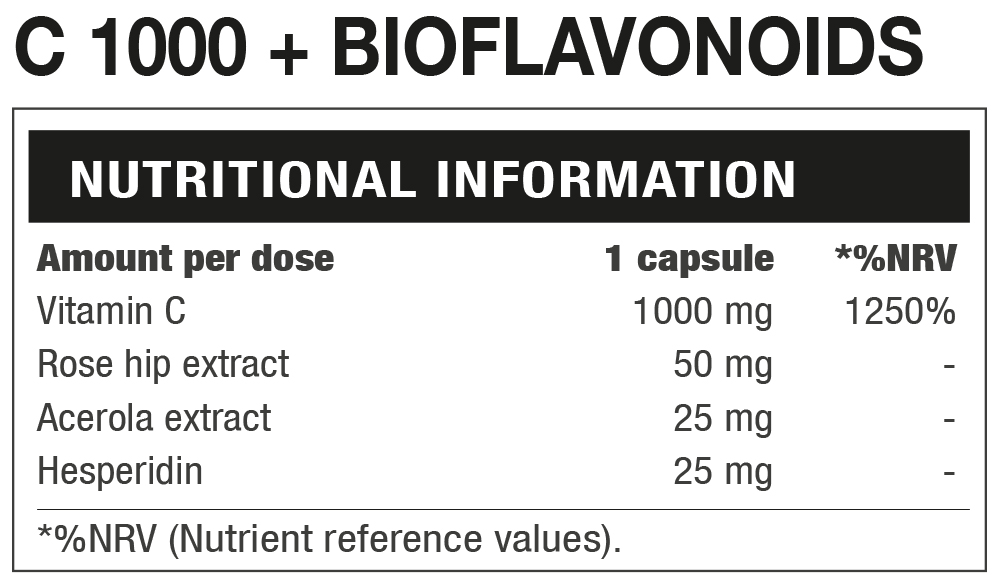 C1000 + BIOFLAVONOIDS of HERO TECH NUTRITION is a food supplement based on vitamin C and bioflavonoids from plant extracts (Rose hip, acerola and hesperidin). C1000 + BIOFLAVONOIDS is a source of vitamin C and contains 1000 mg per recommended daily dose. Vitamin C contributes to the normal formation of collagen for the normal function of blood vessels, bones and cartilage, and to the normal function of the immune system during and after intense physical exercise*.