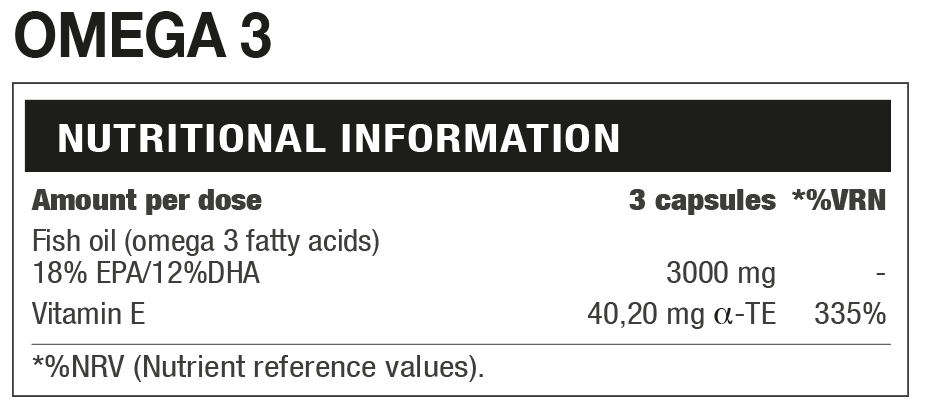 Is a food supplement based on omega 3 fatty acids from fish oil and vitamin E, with a percentage of eicosapentaenoic acid (EPA) and docosahexaenoic acid (DHA) of 18% and 12% respectively. OMEGA 3 90 capsules is a SOURCE OF OMEGA-3 FATTY ACIDS and contains a total amount per recommended daily dose of 540 mg of eicosapentaenoic acid (EPA) and 360 mg of docosahexaenoic acid (DHA).