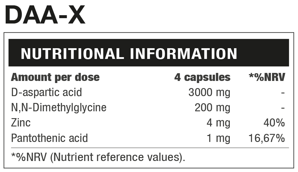 DAA-X is a multi-complex of D-aspartic acid, N,N- Dimethylglycine, zinc and pantothenic acid. D-Aspartic acid is a physiological amino acid that occurs mainly in the pituitary gland and testes and has a role in regulating the release and synthesis of LH and testosterone in humans. Dimethylglycine (DMG) is a derivative of the amino acid glycine found in the cells of all plants and animals and can be obtained in the diet in small amounts from grains and meat. Dimethylglycine was popular among Russian athletes and cosmonauts. Zinc has been added that contributes to the maintenance of normal testosterone levels in the blood, to normal fertility and reproduction and to normal protein synthesis. Pantothenic acid contributes to normal synthesis and metabolism of steroid hormones, vitamin D and some neurotransmitters and to the reduction of tiredness and fatigue. DAA-X is a product with ingredients that are widely used by athletes who want to use scientifically tested legal products. These statements have been authorized by the European Commission.