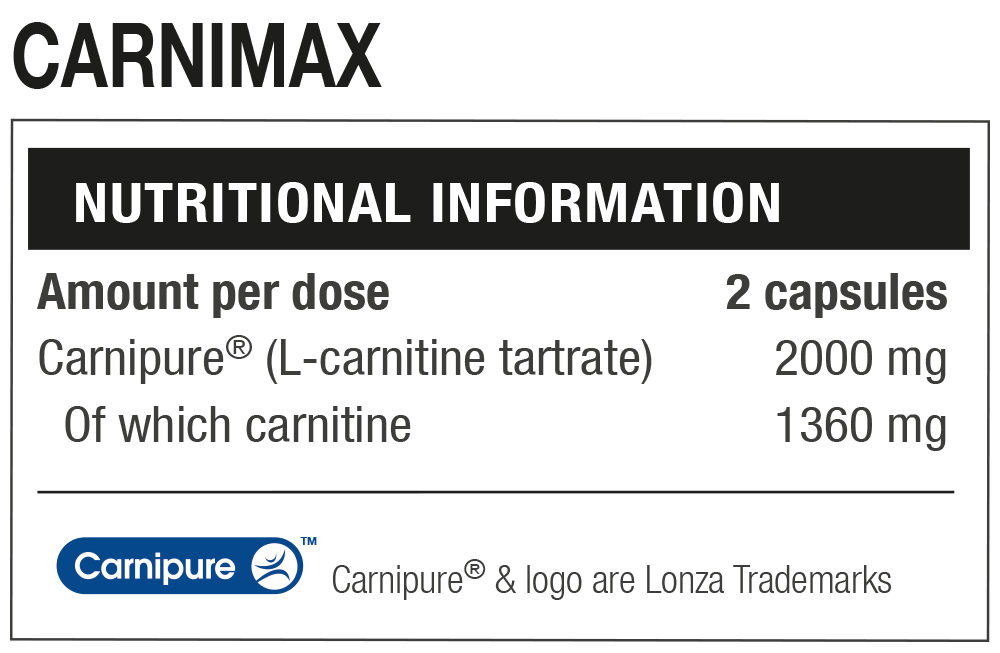 CARNIMAX has been made from L-carnitine tartrate Carnipure®) quality from Lonza Ltd., with a quantity of 1000 mg per capsule.