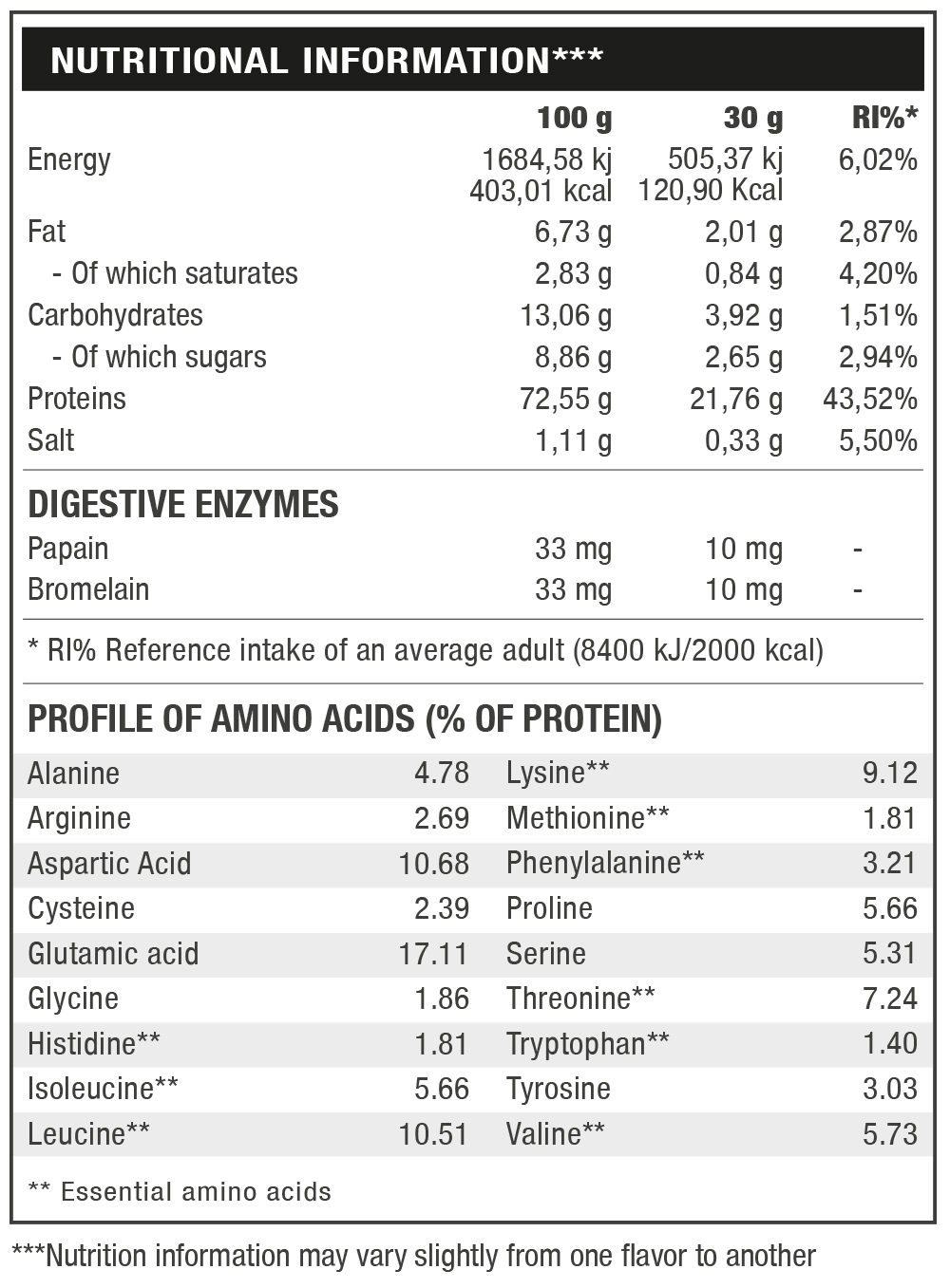 VANILLA: Milk protein 96,59% [Whey protein concentrate (milk), emulsifier (soy lecithin)], flavor, salt, sweeteners (acesulfame k, sucralose), bromelain extracted from Ananas comosus 0,03% (1200 GDU/g), papain extracted from Carica papaya 0,03% (6000 USP). Origin of milk: EU. ALLERGEN INFORMATION: May contain traces of gluten, egg, celery, sulphur dioxide and sulphites, fish, molluscs and crustaceans.
