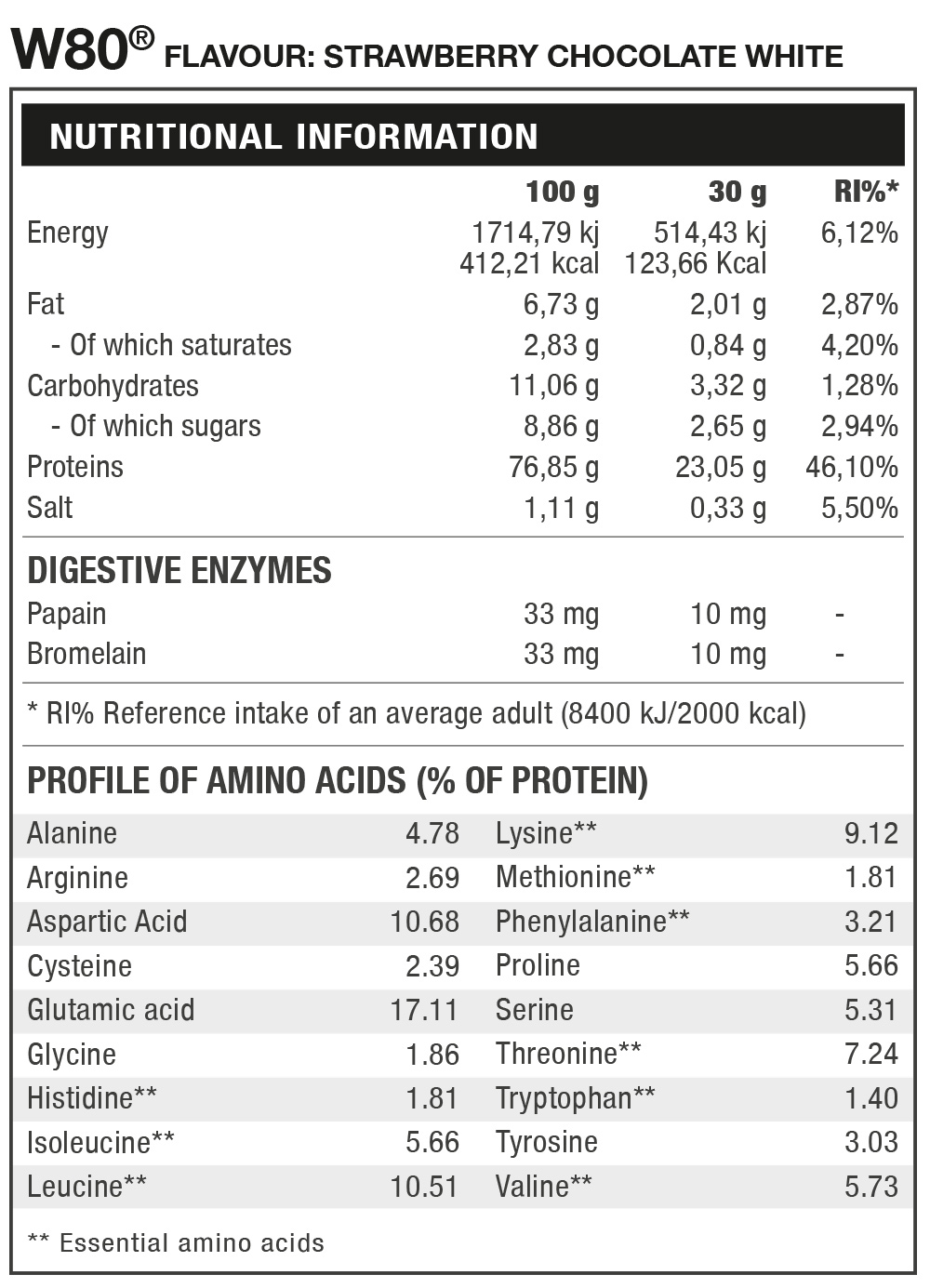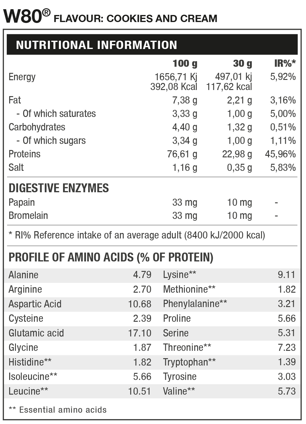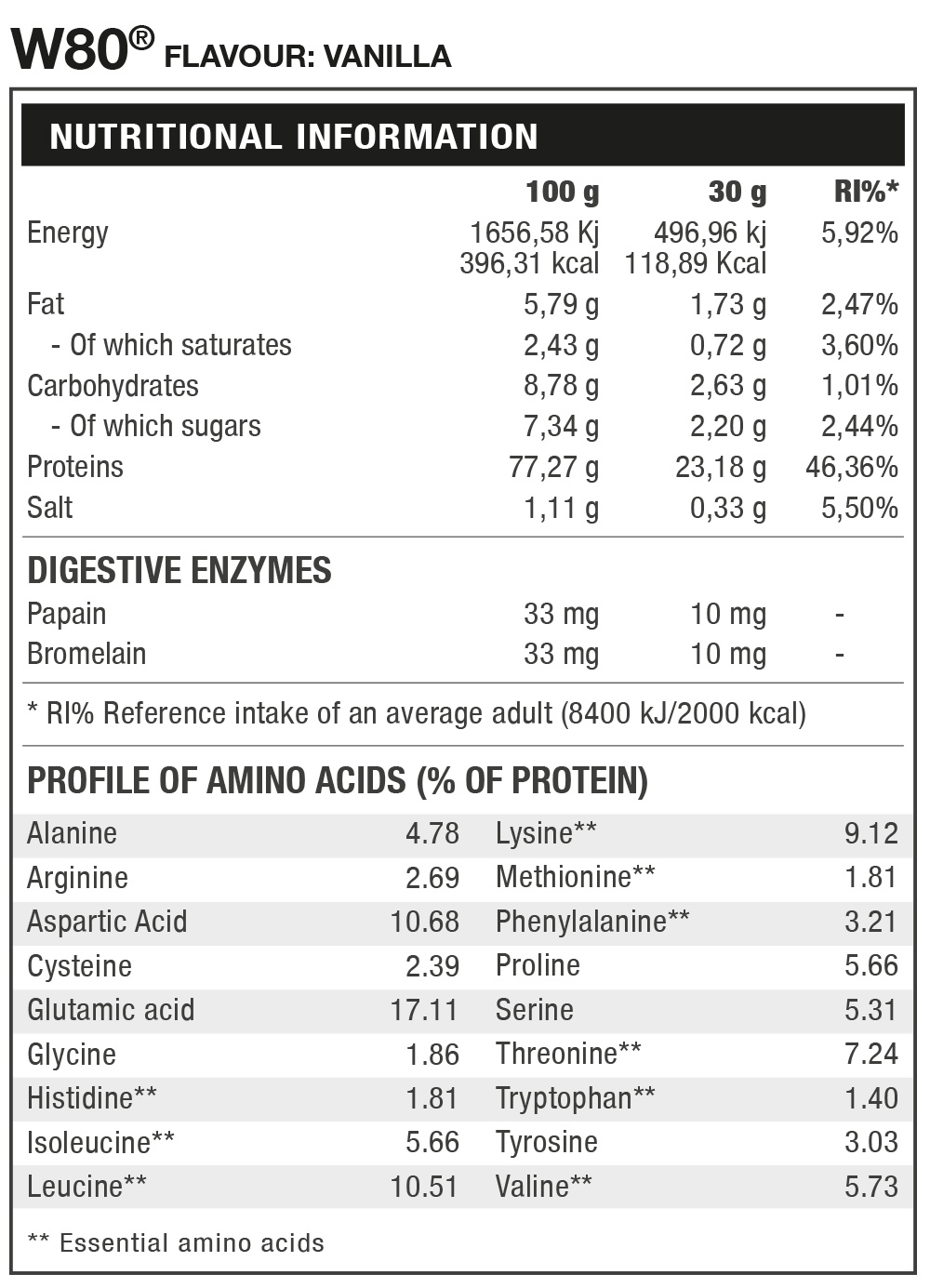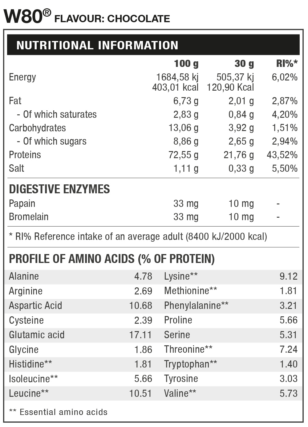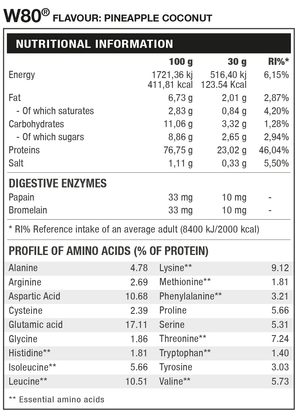 W80 is a professional formula concentrate whey protein obtained by ultrafiltration 100%. W80® is a complete source of nitrogen that contributes to muscle protein of the highest quality to help its development. W80® finally has applied a full array of digestive enzymes. Bromelain and papain are digestive enzymes that greatly facilitate the assimilation and digestion of protein, which makes together with the delicious flavors of W80 enjoy a quality and maximum digestion.