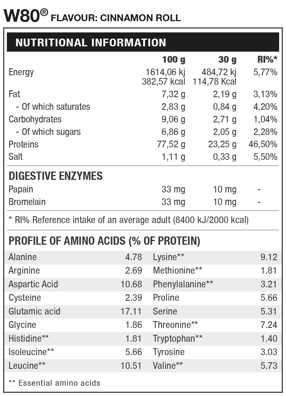 CINNAMON ROLL: Milk protein 97,53% [Whey protein concentrate (milk), emulsifier (soy lecithin)], flavor (contains milk), salt, cinnamon powder 0,5%, sweeteners (acesulfame k, sucralose), bromelain extracted from Ananas comosus 0,03% (1200 GDU/g), papain extracted from Carica papaya 0,03% (6000 USP). Origin of milk: EU. ALLERGEN INFORMATION: May contain traces of gluten, egg, celery, sulphur dioxide and sulphites, fish, molluscs and crustaceans.