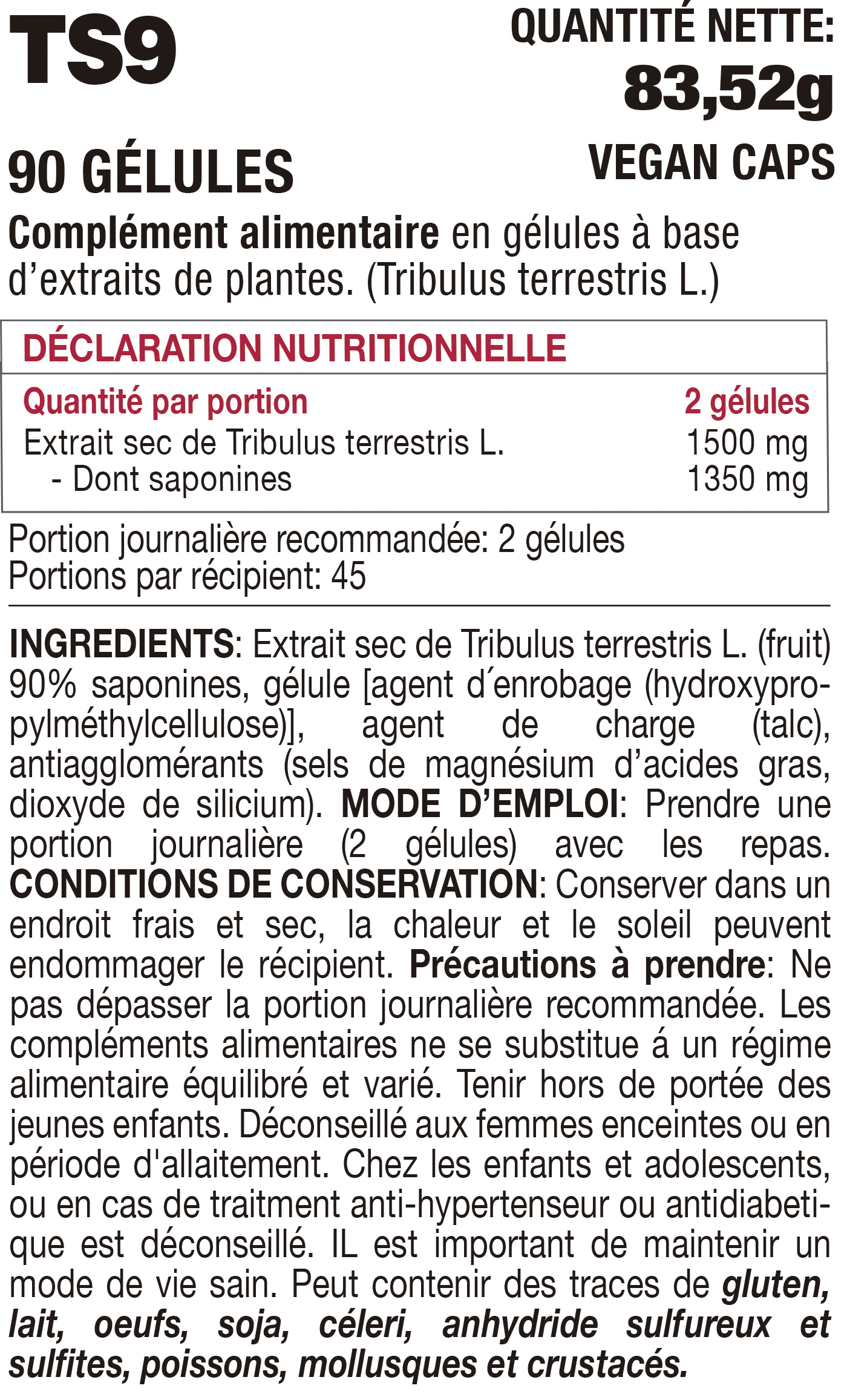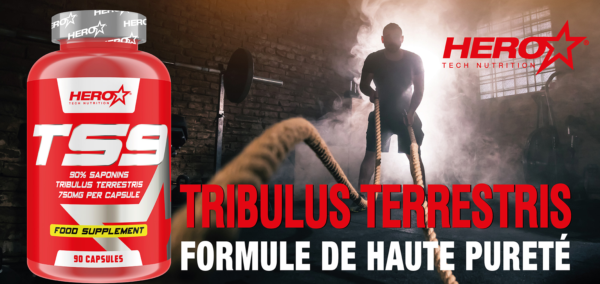 TS9 de HERO TECH NUTRITION. Tribulus Terrestris L.Cette plante de la famille des Zygophyllacées contient de nombreuses variétés naturelles d'ingrédients actifs, notamment des saponines stéroïdiennes, des alcaloïdes β-carbolines, des flavonoïdes et des lignanamides. HERO TECH NUTRITION a conçu TS9 à partir de Tribulus Terrestris de haute qualité, contenant moins de 90 % de savon.