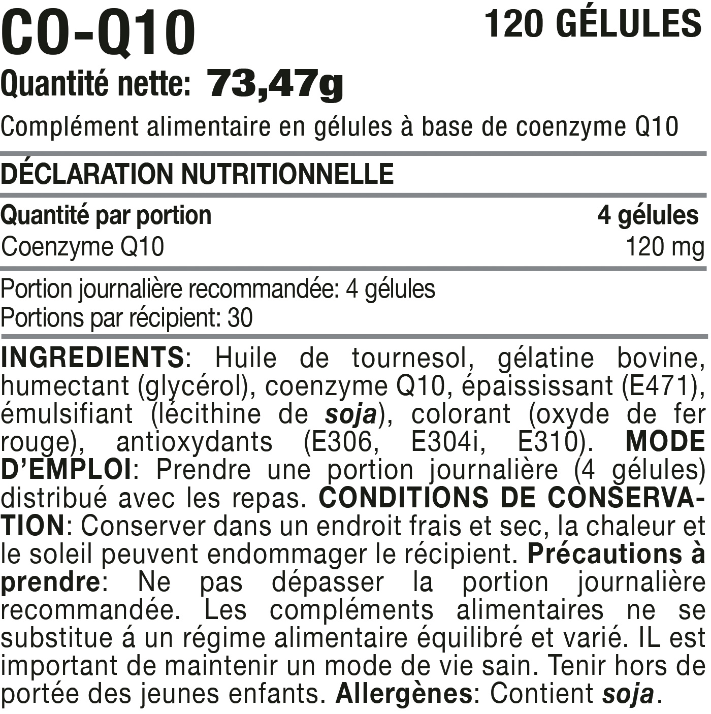 CO-Q10 de HERO TECH NUTRITION est un complément alimentaire à base de coenzyme Q10 apporte 120 mg de coenzyme Q10 par dose quotidienne recommandée. La coenzyme Q10 agit dans l'organisme comme un antioxydant non enzymatique endogène, protégeant les cellules, et en particulier les membranes cellulaires, des dommages que les radicaux libres peuvent causer à des composants importants tels que l'ADN, les lipides et les protéines. La coenzyme Q10, située dans la membrane mitochondriale interne, participe à la respiration cellulaire et fait partie des systèmes enzymatiques de la chaîne respiratoire. Grâce à ce processus, la cellule obtient l'énergie chimique (ATP) nécessaire à sa croissance et à son maintien structurel et fonctionnel. La plus grande partie du contenu tissulaire de la coenzyme se trouve sous forme réduite, sauf dans les poumons et le cerveau, ce qui semble refléter le stress oxydatif plus important de ces organes (Crane, 2001). Il est important de maintenir une alimentation variée et équilibrée et un mode de vie sain.