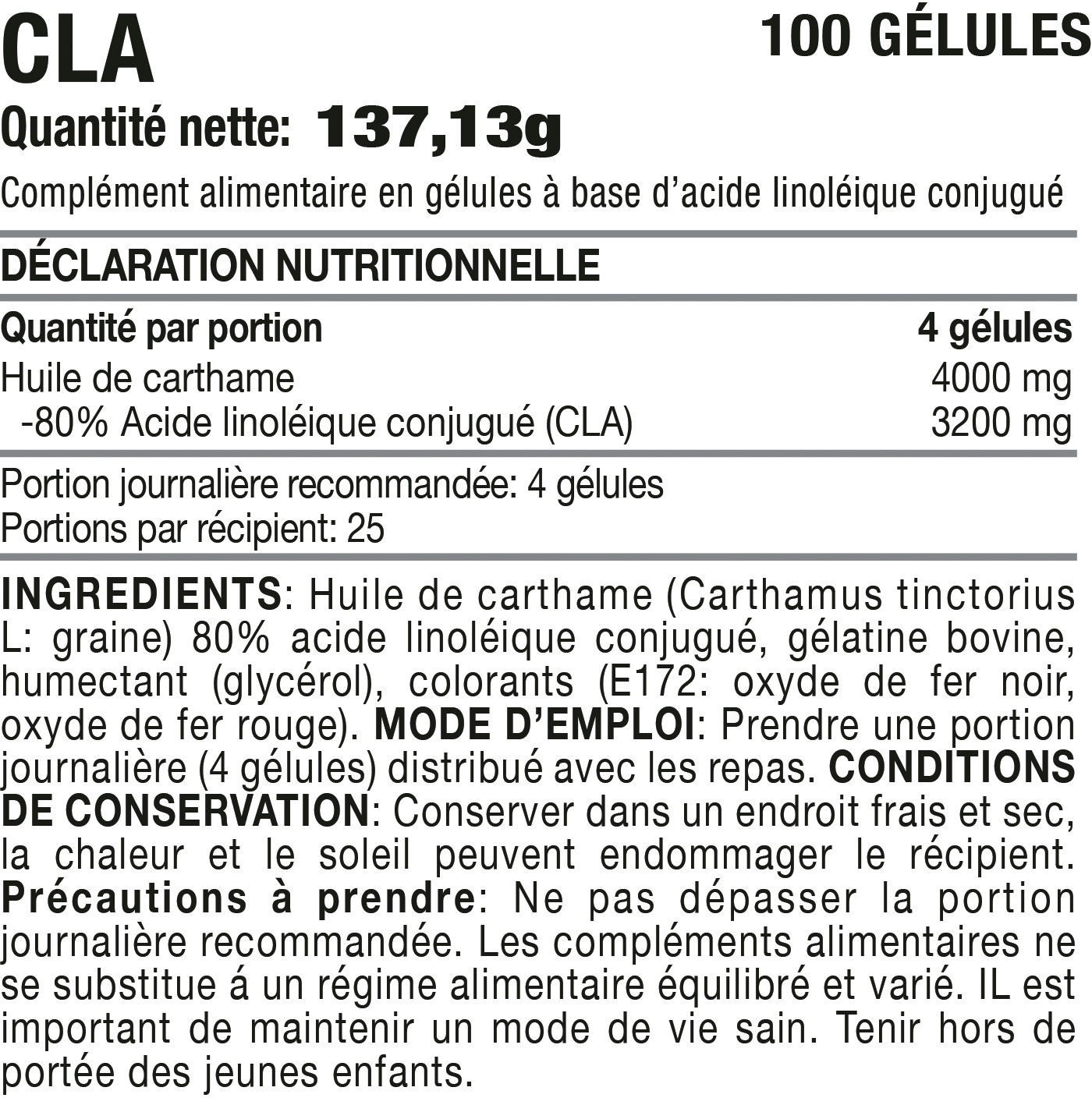 CLA de HERO TECH NUTRITION est un complément alimentaire à base d'acide linoléique conjugué combine différents types d'acide linoléique issus de l'huile de carthame. 100 gélules de CLA contiennent 4 000 mg d'huile de graine de carthame (Carthamus tinctorius L.), soit un total de 3 200 mg d'acide linoléique par dose journalière recommandée. L'apport quotidien recommandé est donc supérieur à la dose minimale de 1,5 g d'acide linoléique pour 100 g et 100 kcal. * L’acide alpha-linolénique (ALA) contribue au maintien d’une cholestérolémie normale. L’effet bénéfique est obtenu par la consommation journalière de 2 g d’ALA. Il est important de maintenir une alimentation variée et équilibrée et un mode de vie sain. *Ces allégations santé ont été évaluées par l'Agence européenne de sécurité des aliments (EFSA) et approuvées par la Commission européenne.