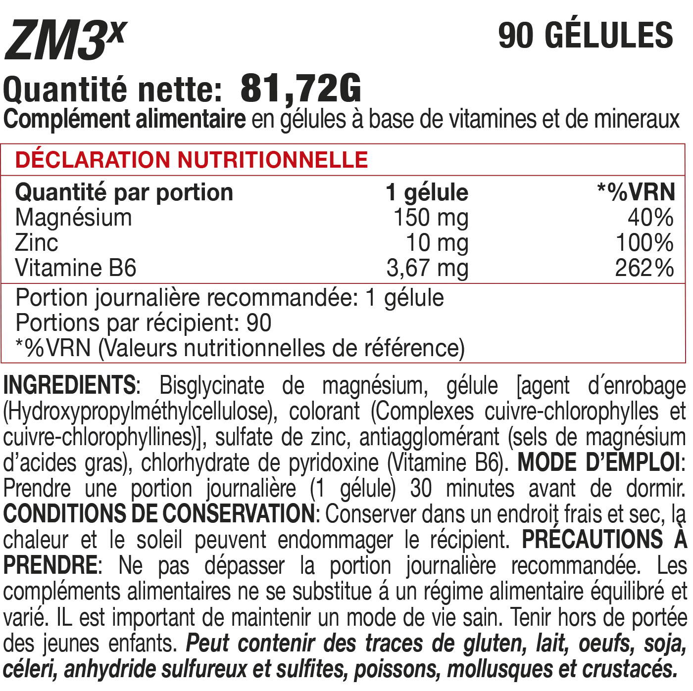 ZM3X de HERO TECH NUTRITION est un complément alimentaire et une source de zinc, de magnésium et de vitamine B6. *Source de vitamine B6, qui contribue à réguler l’activité hormonale. *Source de zinc, qui qui contribue au maintien d’un taux normal de testostérone dans le sang et contribue à une fertilité et une reproduction normales. C'est également une source de magnésium, qui contribue à réduire la fatigue et à contribuer à une synthèse protéique normale. Il est important d'avoir une alimentation variée et équilibrée et un mode de vie sain. Ces affirmations ont été évaluées par l'EFSA (Agence européenne de sécurité des aliments) et approuvées par la Commission européenne.