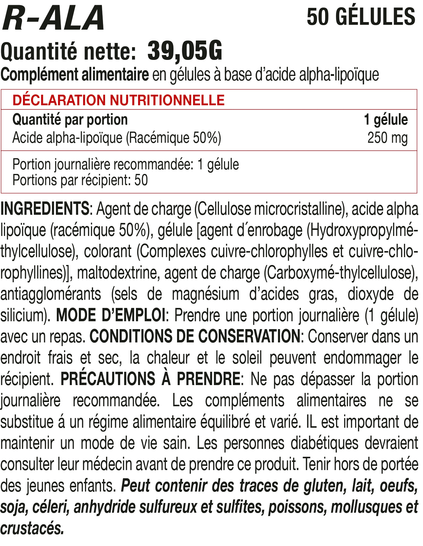R-ALA de HERO TECH NUTRITION est un complément alimentaire à base d'acide alpha-lipoïque apporte 250 mg par dose quotidienne. L'acide lipoïque est un composé naturel présent dans l'organisme et dans certains aliments. R-ALA est une formule à 50 % d'acide alpha-lipoïque (R) racémique. Chimiquement, l'acide alpha-lipoïque est un acide gras non essentiel dont la structure est bien définie et contient deux atomes de soufre et un centre chiral, donnant naissance aux formes énantiomériques R et S.