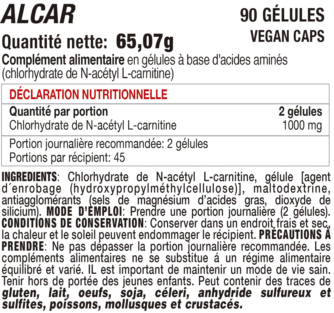 ALCAR de HERO TECH NUTRITION est un complément alimentaire à base de chlorhydrate de N-acétyl-L-carnitine. L'acétyl-L-carnitine (ALC) est un ester de l'acide aminé triméthylé L-carnitine et est synthétisée dans le cerveau, le foie et les reins humains par l'enzyme ALC-transférase. L'acétyl-L-carnitine facilite l'absorption de l'acétyl-CoA par les mitochondries lors de l'oxydation des acides gras. ALCAR est disponible en capsules de 500 mg pour une dose quotidienne recommandée de 1000 mg.