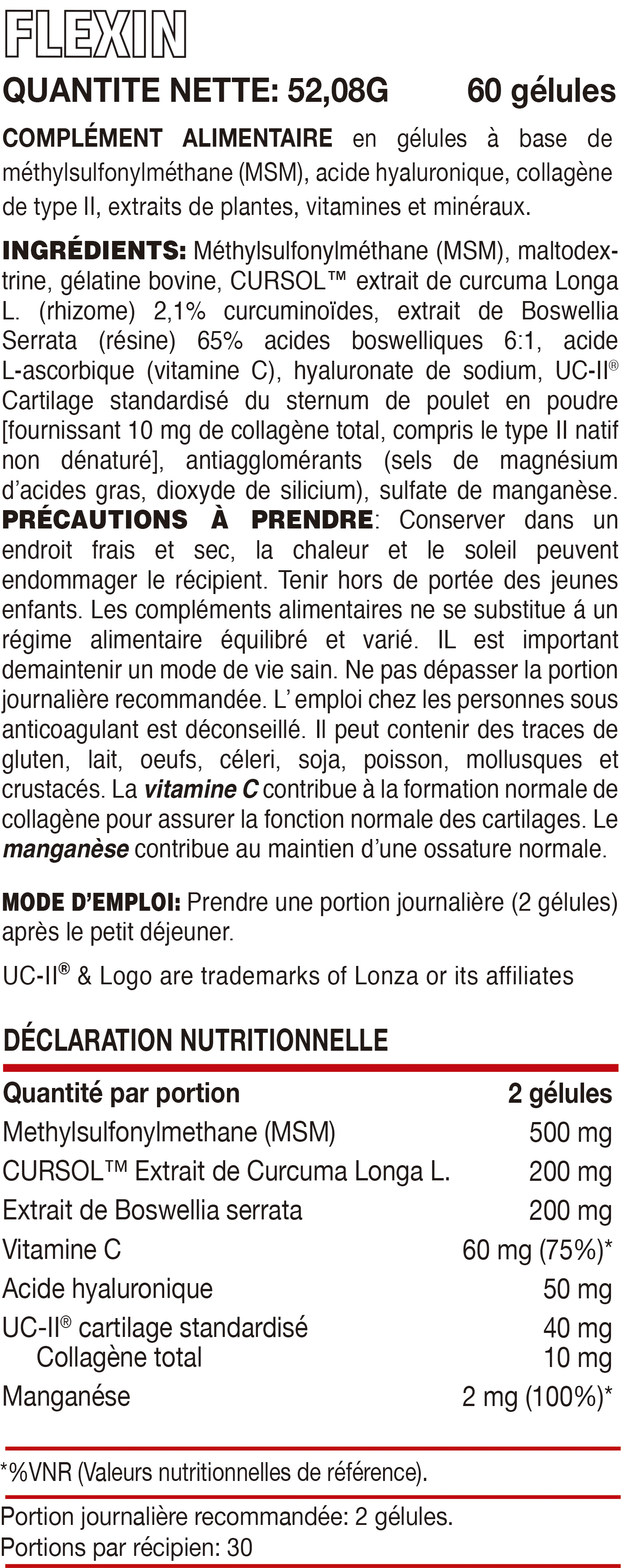 FLEXIN de HERO TECH NUTRITION Source de manganèse et de vitamine C. *Le manganèse contribue à la formation normale de tissus conjonctifs et au maintien d’une ossature normale. *La vitamine C contribue à la formation normale de collagène pour assurer la fonction normale des cartilages et des os. FLEXIN est complété par : • L'UC-II® est un cartilage breveté issu de sternum de poulet, contenant du collagène de type II natif non dénaturé. FLEXIN contient 40 mg d'UC-II® par dose journalière recommandée. • Curcumine L. (CURSOL™) est un extrait breveté de curcumine L. présentant une solubilité élevée de 29,68 %. • Boswellia serrata. • Acide hyaluronique. Le hyaluronate de sodium est le sel de sodium de l'acide hyaluronique, composé à 95 % d'acide hyaluronique. L'acide hyaluronique est un polysaccharide de haut poids moléculaire (glycosaminoglycane) produit principalement par les fibroblastes et d'autres cellules spécialisées du tissu conjonctif. • Le MSM est un composé organique soufré très stable (34 %), présent en faibles quantités dans une grande variété de fruits, légumes, céréales, viandes, œufs et poissons. Il est important de maintenir une alimentation variée et équilibrée et un mode de vie sain. Ce produit est un complément alimentaire et n'est donc pas un médicament. Il n'est pas destiné à prévenir, traiter ou guérir une quelconque maladie. *Ces déclarations ont été évaluées par l'Autorité européenne de sécurité des aliments (EFSA) et approuvées par la Commission européenne. UC-II® et le logo sont des marques déposées de Lonza ou de ses filiales.