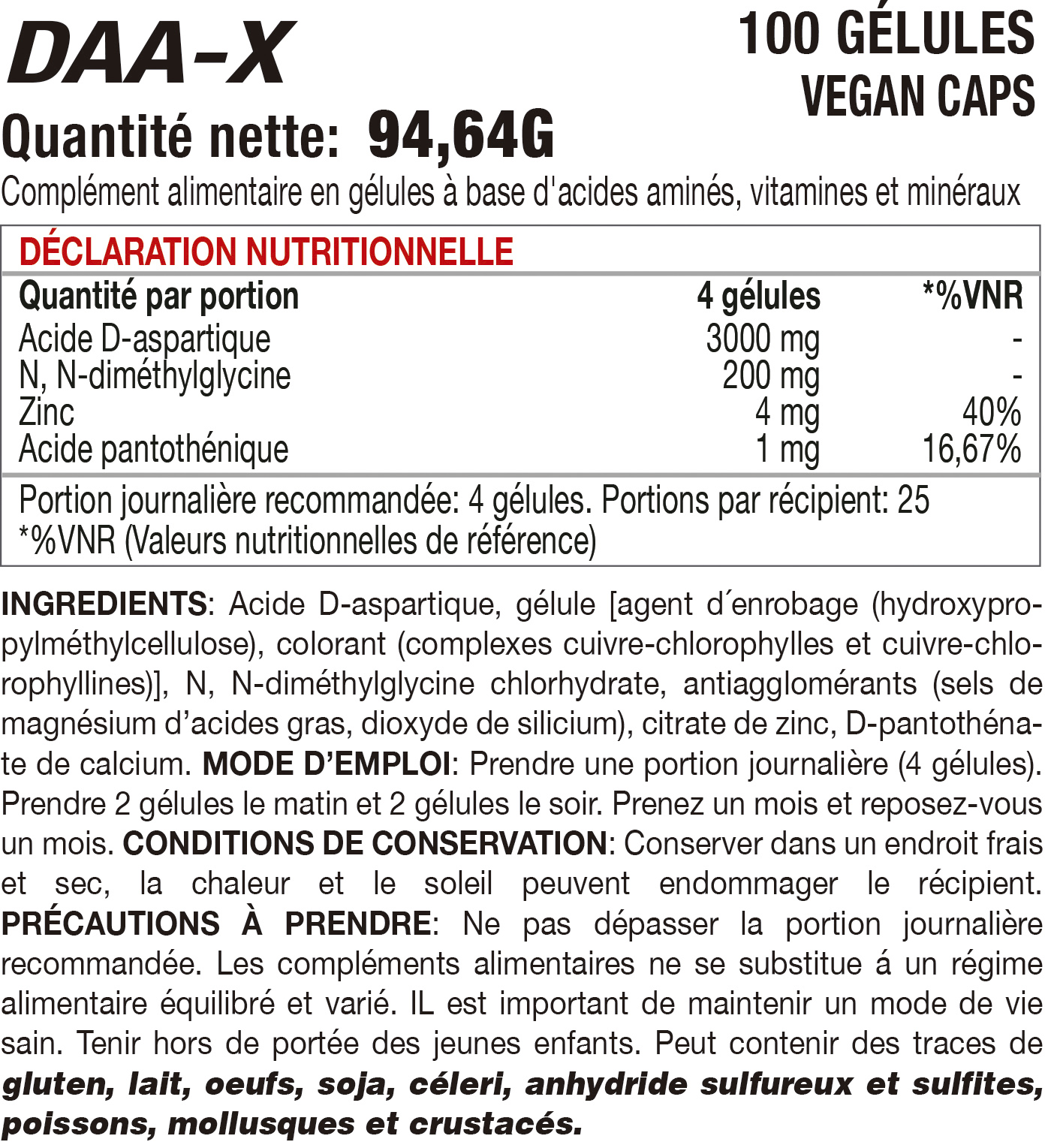 DAA-X de HERO TECH NUTRITION est un multicomplexe d'acide D-aspartique, de N,N-diméthylglycine, de zinc et d'acide pantothénique. DAA-X est un produit dont les ingrédients sont largement utilisés par les athlètes souhaitant utiliser des compléments alimentaires légaux et ainsi éviter l'utilisation de substances interdites.