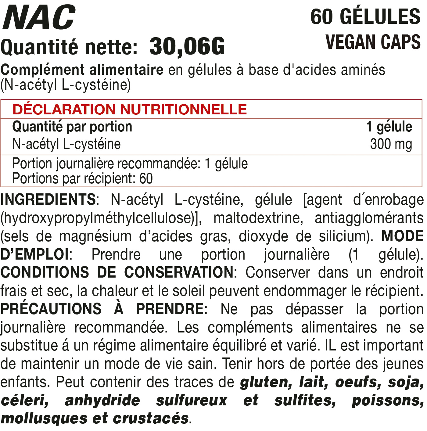 NAC de HERO TECH NUTRITION est un Complément alimentaire à base de N-acétyl-L-cystéine. La N-acétyl-L-cystéine est un dérivé acétylé de la cystéine. La cystéine est un acide aminé aux propriétés antioxydantes. NAC de HERO TECH NUTRITION est un Complément alimentaire à base de N-acétyl-L-cystéine. La N-acétyl-L-cystéine est un dérivé acétylé de la cystéine. Source de L-cystéine, la N-acétyl-L-cystéine est un précurseur nutritionnel de la L-cystéine, dont la valeur nutritionnelle correspond à celle de ce dernier acide aminé. La N-acétyl-L-cystéine administrée par voie orale est rapidement absorbée. Source de L-cystéine. La cystéine est un acide aminé aux propriétés antioxydantes. C'est un antioxydant indirect qui facilite la biosynthèse du glutathion et restaure les niveaux de glutathion réduits par le stress oxydatif.