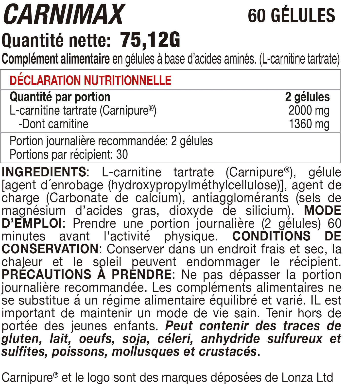 CARNIMAX de HERO TECH NUTRITION est un complément alimentaire à base de tartrate de L-carnitine de qualité Carnipure® de Lonza Ltd. CARNIMAX de HERO TECH NUTRITION est un complément alimentaire est à base de tartrate de L-carnitine de qualité Carnipure® de Lonza Ltd. La L-carnitine (ß-hydroxy-g-triméthylaminobutyrate) est un dérivé des acides aminés L-lysine et L-méthionine. Largement distribuée dans tous les tissus des mammifères, elle est très abondante dans les tissus musculaires. La L-carnitine facilite l'entrée des acides gras à longue chaîne dans la matrice mitochondriale, où ils sont oxydés. Elle favorise également la libération des acides gras à chaîne courte des mitochondries vers le cytosol, réduit la production de lactate et améliore la stabilité des membranes cellulaires. CARNIMAX est fabriqué à partir de tartrate de L-carnitine de qualité Carnipure® de Lonza Ltd., à raison de 1 000 mg par gélule. Il est recommandé de prendre une dose de CARNIMAX 60 minutes avant l'effort physique.