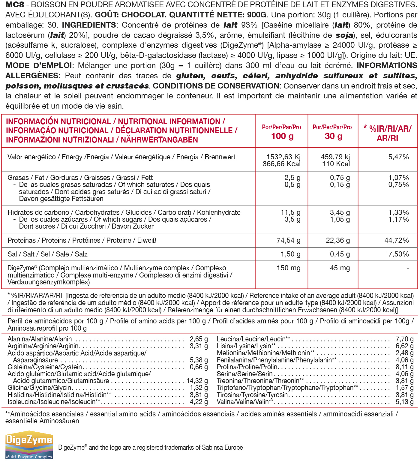 MC8 par HERO TECH NUTRITION - Il s'agit d'une poudre hyperprotéinée prête à l'emploi contenant 80 % de caséine micellaire dans un complexe de concentré de protéines de lait (MPC), qui représente 93 % de la portion totale. MC8 présente une *TENEUR ÉLEVÉE EN PROTÉINES et une teneur élevée en L-glutamine (14 %), ainsi que des enzymes digestives (Digezyme®). *Les protéines contribuent à augmenter la masse musculaire. La caséine se digère plus lentement que les protéines de lactosérum ; il est donc idéal de la prendre lors des repas à intervalles réguliers, et il est également recommandé de la prendre avant le coucher.