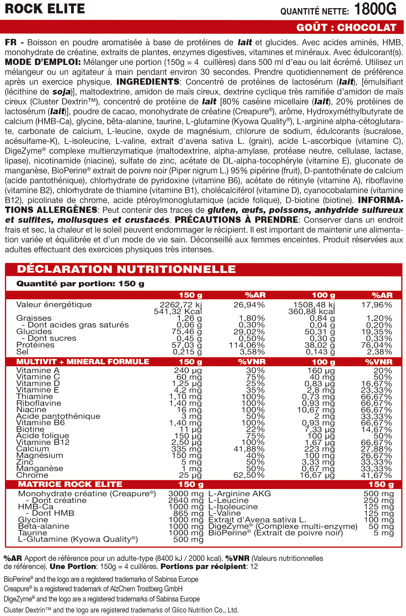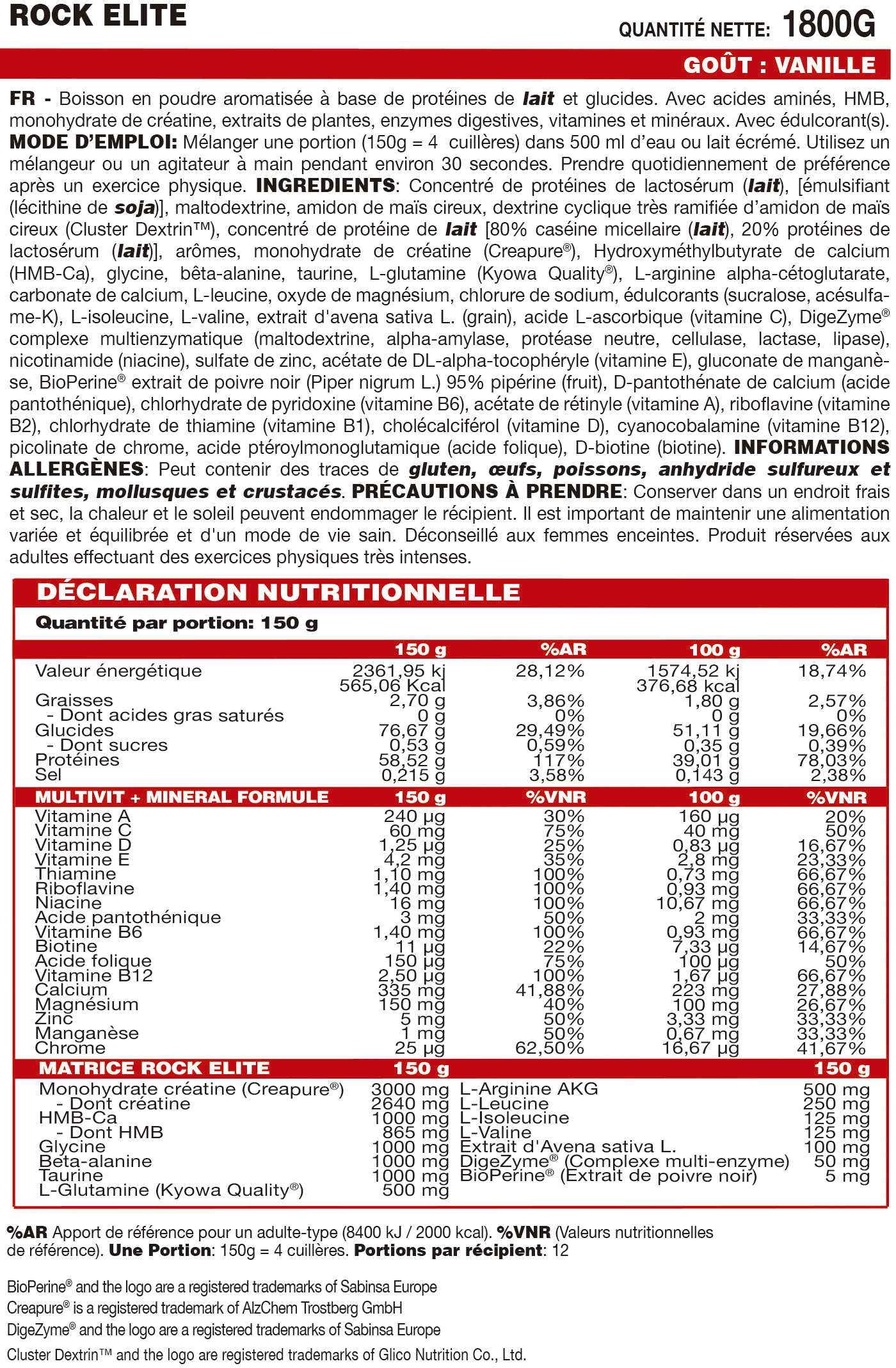 ROCK ELITE est réservées aux adultes effectuant des exercices physiques très intenses et dont la constitution physique spécifique requiert un produit riche en protéines et riche en glucides « SANS SUCRE ». • Les protéines contribuent à augmenter la masse musculaire. Ce produit est une boisson hyperprotéinée contenant jusqu'à 58 grammes de concentré de protéines de lactosérum à haute valeur biologique (VB) et de caséine par portion, associés à une matrice glucidique de 3 types, dont la Cluster Dextrin™, une dextrine cyclique hautement ramifiée dérivée de l'amidon de maïs. La Cluster Dextrin™ est un glucide de nouvelle génération, hautement soluble et facile à digérer. Elle est également très soluble et hautement digestible, sans les effets digestifs négatifs des autres glucides. De plus, ROCK ELITE est complété par une formule complète de vitamines et de minéraux tels que •la vitamine D, le calcium et le magnésium qui contribuent au contribue à une fonction musculaire normale, avec •le zinc qui contribue au maintien d’un taux normal de testostérone dans le sang, avec •l'acide pantothénique, l'acide folique, le fer, la niacine (vitamine B3), B2, B6, B12 et la vitamine C qui contribue à réduire la fatigue•.