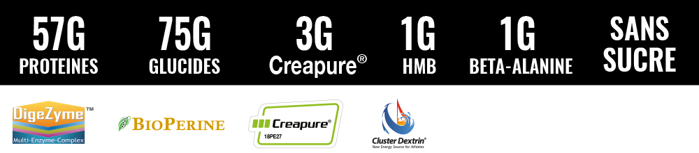 ROCK ELITE de HERO TECH NUTRITION est un COMPLEXE TOUT-EN-UN avec une formule glucidique (HC) et protéique (P) avec un ratio 55HC/45P renforcé d'acides aminés, HMB, créatine, extraits de plantes, enzymes digestives, vitamines et minéraux.